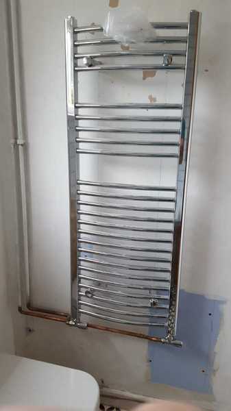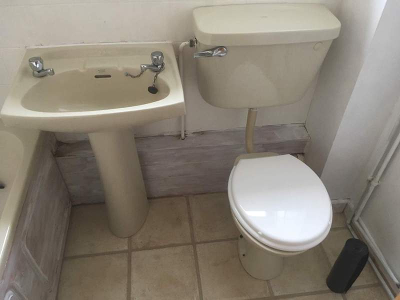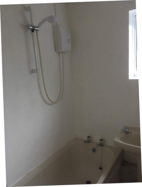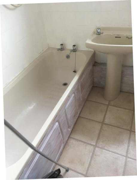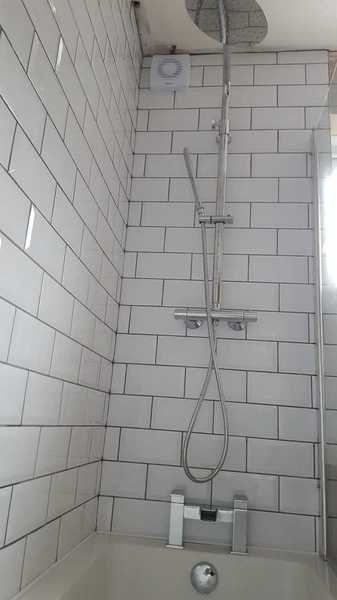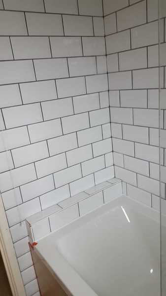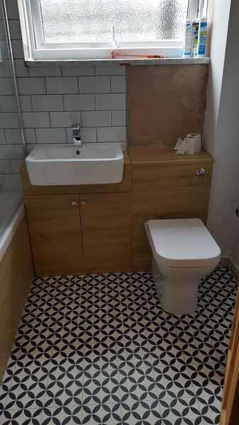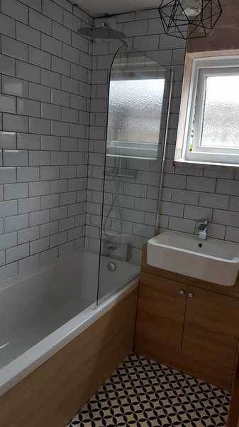 Customer desined their family bathroom them selves. Sourced all fixtures and tiles. We removed old tiles and fixtures. Repaired walls. installed new bath and vanity units with basin and toilet. Replaced electric shower with thermostatic. Installed towel rail instead of radiator. Tiled walls with white metro tiles. Grouted with grey grout. leveled floorand layed black & white lino.