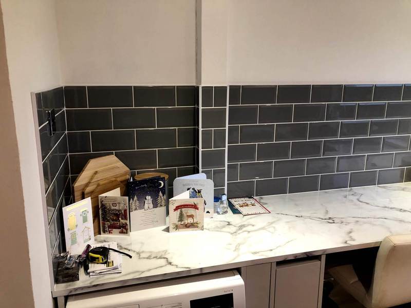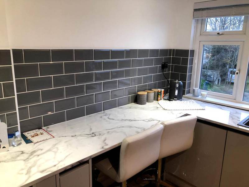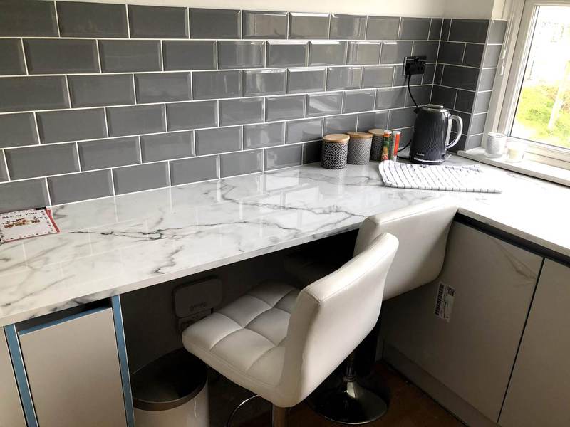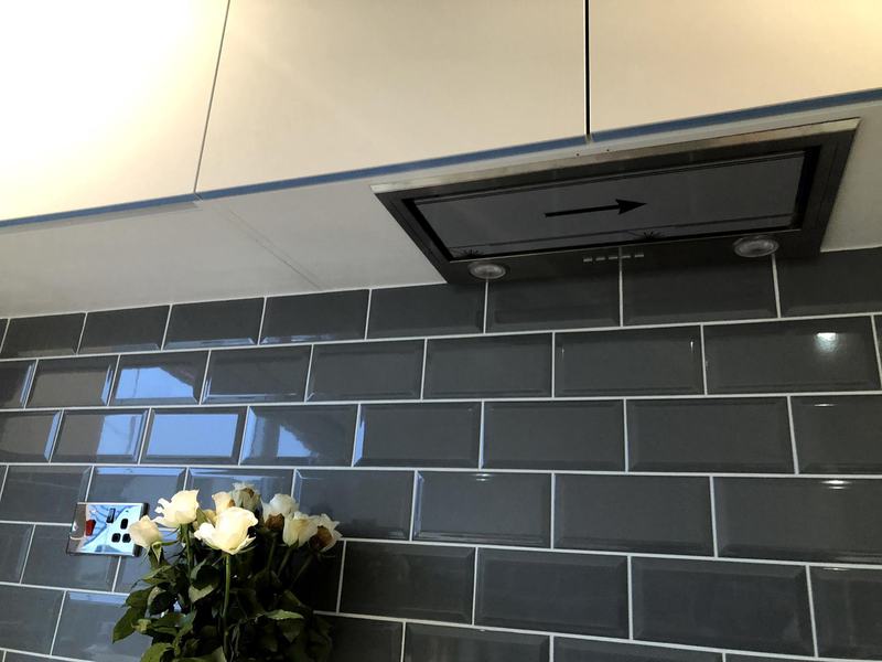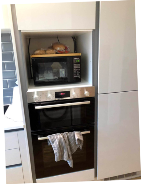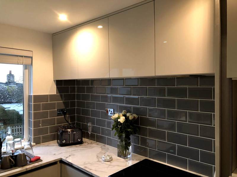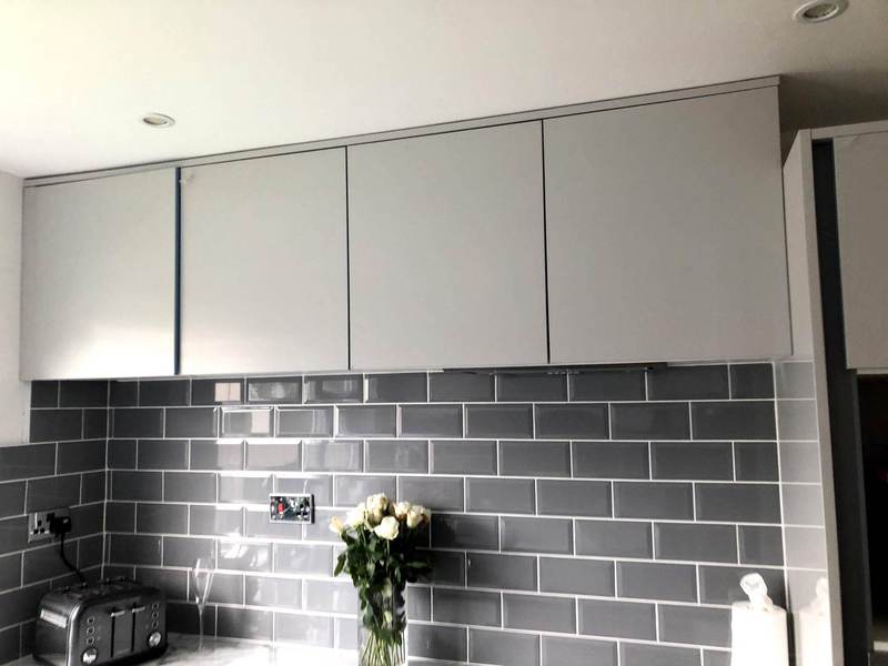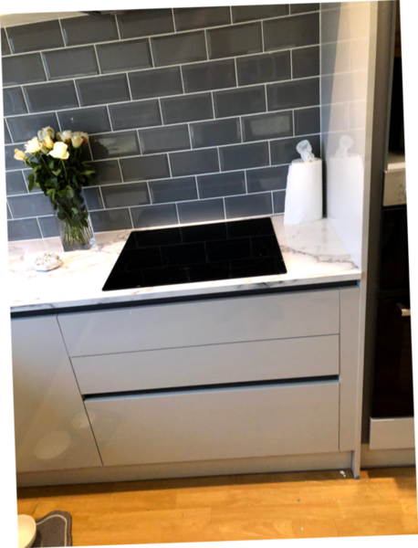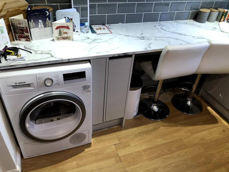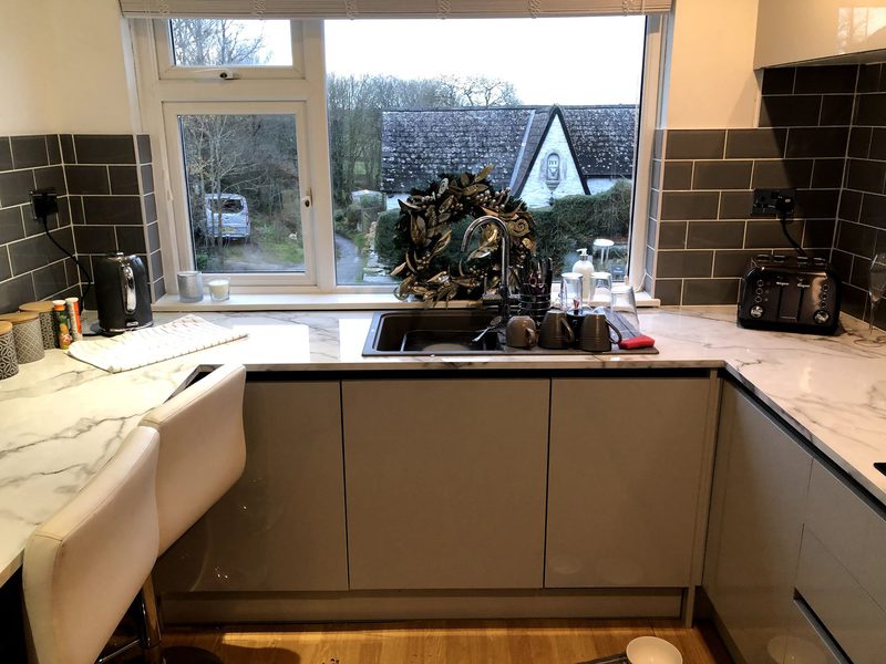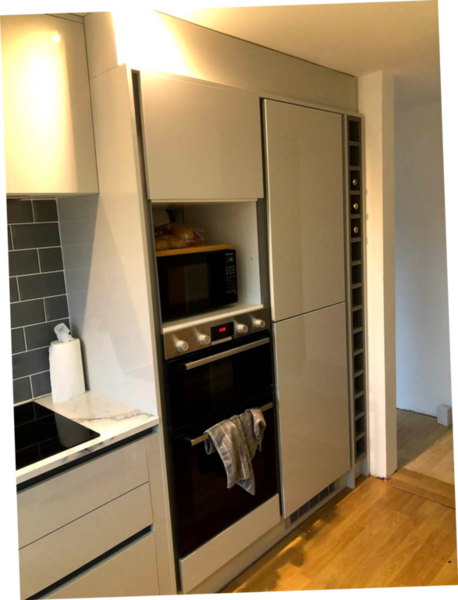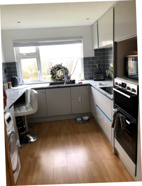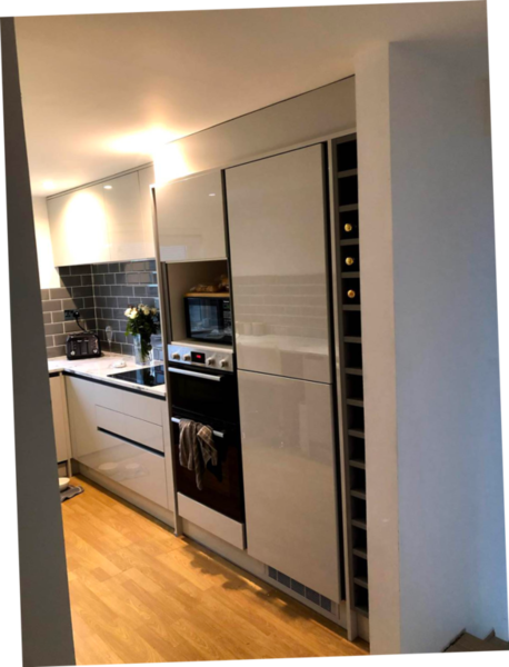 Infinity Plus Milano Ultra handlless kitchen. Cloud Gloss doors and panels. Unit carcase white edged. 22mm luxury laminate Calacatta Cloud Gloss work top. Minorca composite 1.0 bowl sink. Perla tap. Built-in Bosch double oven. Bosch ceramic 4 burner hob. Faber Inca lux canopy hood. Zanussi integrated fridge/freezer. Bosch integrated slimline dishwasher. CDA fully integrated washing machine. Freestanding dryer.